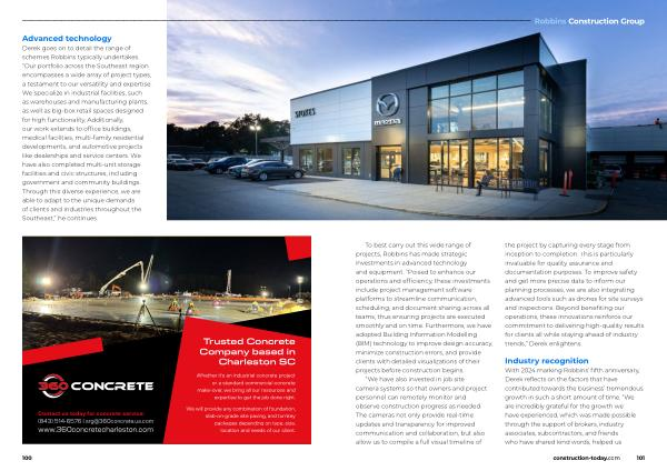 schemes Robbins typically undertakes . “ Our portfolio across the Southeast region encompasses a wide array of project types , a testament to our versatility and expertise . We specialize in industrial facilities , such as warehouses and manufacturing plants , as well as big-box retail spaces designed for high functionality . Additionally , our work extends to office buildings , medical facilities , multi-family residential developments , and automotive projects like dealerships and service centers . We have also completed multi-unit storage facilities and civic structures , including government and community buildings . Through this diverse experience , we are able to adapt to the unique demands of clients and industries throughout the Southeast ,” he continues .