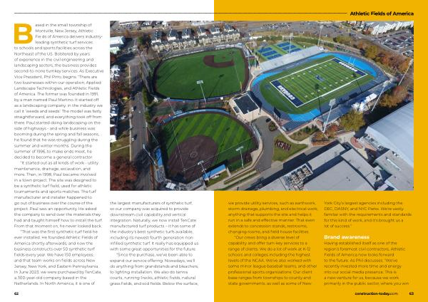 Based in the small township of Montville , New Jersey , Athletic Fields of America delivers industryleading synthetic turf services to schools and sports facilities across the Northeast of the US . Bolstered by years of experience in the civil engineering and landscaping sectors , the business provides second-to-none turnkey services . As Executive Vice President , Phil Pirro , begins : “ There are two businesses within our operation , Applied Landscape Technologies , and Athletic Fields of America . The former was founded in 1991 , by a man named Paul Martino . It started off as a landscaping company : in the industry we call it ‘ weeds and seeds ’. The model was fairly straightforward , and everything took off from there . Paul started doing landscaping on the side of highways - and while business was booming during the spring and fall seasons , he found that he was struggling during the summer and winter months . During the summer of 1996 , to make ends meet , he decided to become a general contractor .