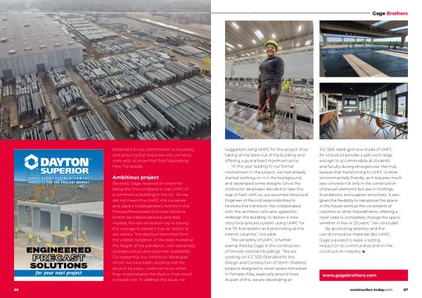 The versatility of UHPC is further exemplified by Gage in the construction of tornado-resistant buildings . “ We are working on ICC 500 ( Standard for the Design and Construction of Storm Shelters ) projects designed to resist severe tornadoes in Tornado Alley , especially around Iowa . As part of this , we are developing an
