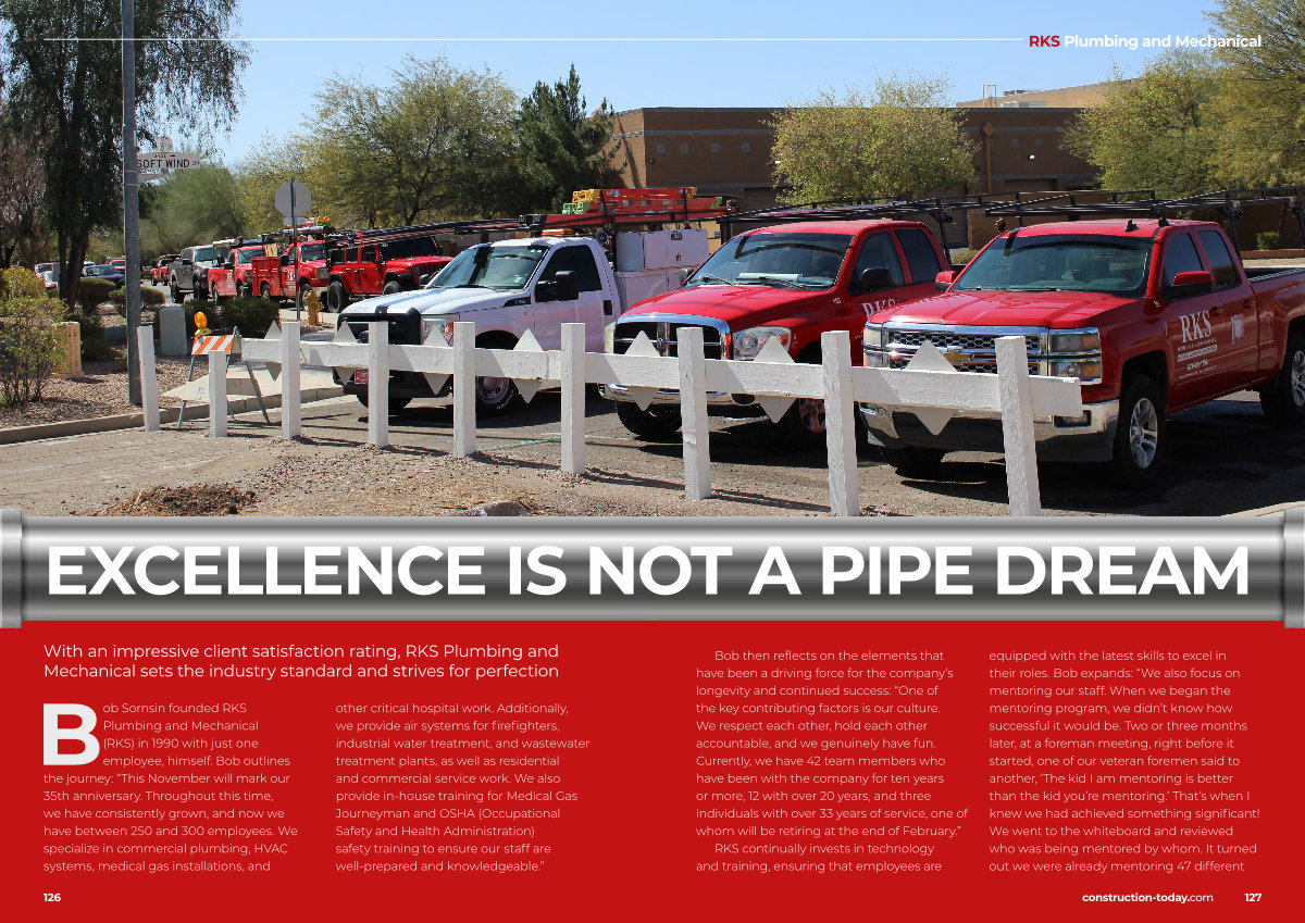 Bob then reflects on the elements that have been a driving force for the company’ s longevity and continued success:“ One of the key contributing factors is our culture. We respect each other, hold each other accountable, and we genuinely have fun. Currently, we have 42 team members who have been with the company for ten years or more, 12 with over 20 years, and three individuals with over 33 years of service, one of whom will be retiring at the end of February.” RKS continually invests in technology and training, ensuring that employees are equipped with the latest skills to excel in their roles. Bob expands:“ We also focus on mentoring our staff. When we began the mentoring program, we didn’ t know how successful it would be. Two or three months later, at a foreman meeting, right before it started, one of our veteran foremen said to another,‘ The kid I am mentoring is better than the kid you’ re mentoring.’ That’ s when I knew we had achieved something significant! We went to the whiteboard and reviewed who was being mentored by whom. It turned out we were already mentoring 47 different