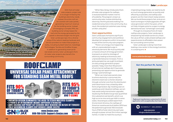 Solar Landscape taps into a diverse array of the nation’ s leading hardware and service providers to make these projects a reality, including Sunbelt Solomon, SolarEdge Technologies, Tavrida and SnoBlox-Snojax. In addition to generating revenue for real estate owners, Solar Landscape’ s frontof-meter solar projects also benefit the surrounding community.