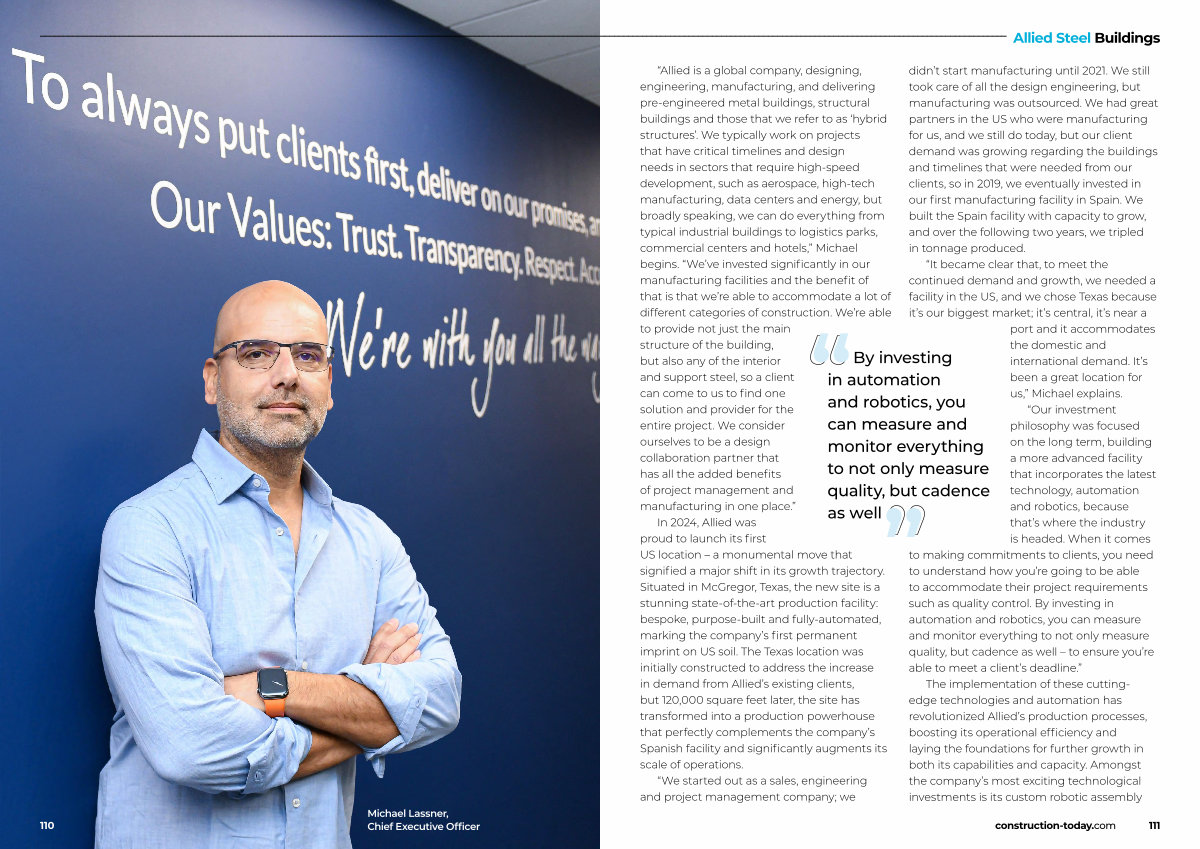 “ Allied is a global company, designing, engineering, manufacturing, and delivering pre-engineered metal buildings, structural buildings and those that we refer to as‘ hybrid structures’. We typically work on projects that have critical timelines and design needs in sectors that require high-speed development, such as aerospace, high-tech manufacturing, data centers and energy, but broadly speaking, we can do everything from typical industrial buildings to logistics parks, commercial centers and hotels,” Michael begins.“ We’ ve invested significantly in our manufacturing facilities and the benefit of that is that we’ re able to accommodate a lot of different categories of construction. We’ re able to provide not just the main structure of the building, but also any of the interior and support steel, so a client can come to us to find one solution and provider for the entire project. We consider ourselves to be a design collaboration partner that has all the added benefits of project management and manufacturing in one place.”