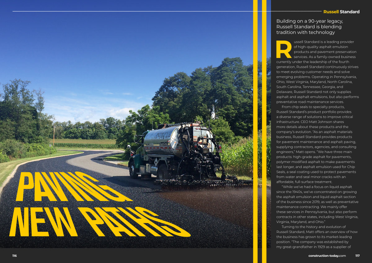 Russell Standard is a leading provider of high-quality asphalt emulsion products and pavement preservation services. As a family-owned business currently under the leadership of the fourth generation, Russell Standard continuously strives to meet evolving customer needs and solve emerging problems. Operating in Pennsylvania, Ohio, West Virginia, Maryland, North Carolina, South Carolina, Tennessee, Georgia, and Delaware, Russell Standard not only supplies asphalt and asphalt emulsions, but also performs preventative road maintenance services.