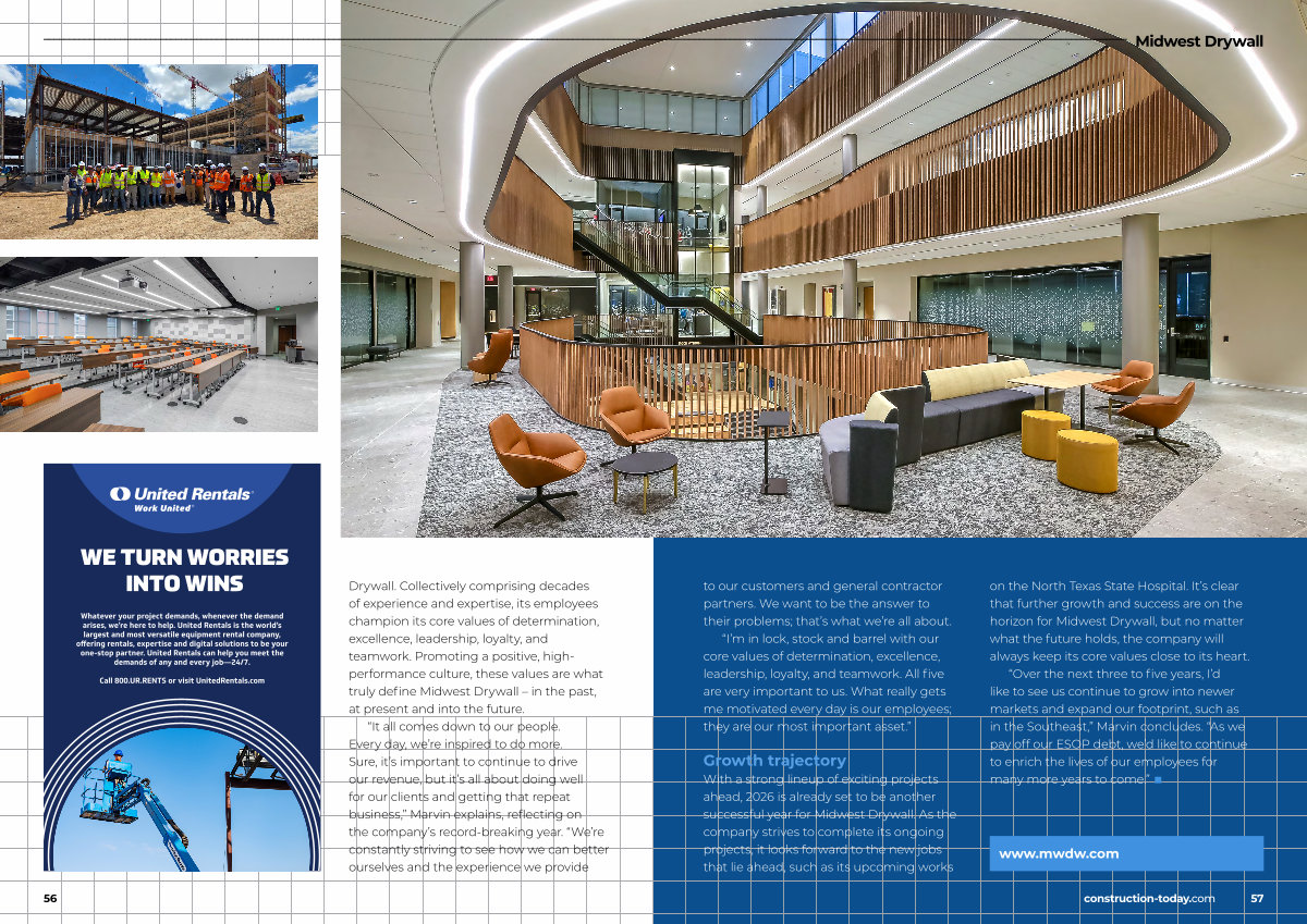 With a strong lineup of exciting projects ahead, 2026 is already set to be another successful year for Midwest Drywall. As the company strives to complete its ongoing projects, it looks forward to the new jobs that lie ahead, such as its upcoming works on the North Texas State Hospital. It’ s clear that further growth and success are on the horizon for Midwest Drywall, but no matter what the future holds, the company will always keep its core values close to its heart.“ Over the next three to five years, I’ d like to see us continue to grow into newer markets and expand our footprint, such as in the Southeast,” Marvin concludes.“ As we pay off our ESOP debt, we’ d like to continue to enrich the lives of our employees for many more years to come.” ■