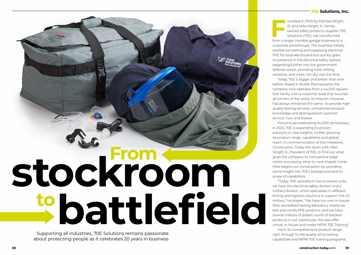 Founded in 2005 by Michael Wright Sr. and Mike Wright Jr., familyowned safety products supplier, 70E Solutions( 70E), has transformed from a single, humble garage business to a corporate powerhouse. The business initially started out testing and supplying electrical PPE for local electricians but quickly grew its presence in the electrical safety sphere, expanding further into the government defense sector, providing tools, kitting solutions, and more; the sky was the limit.