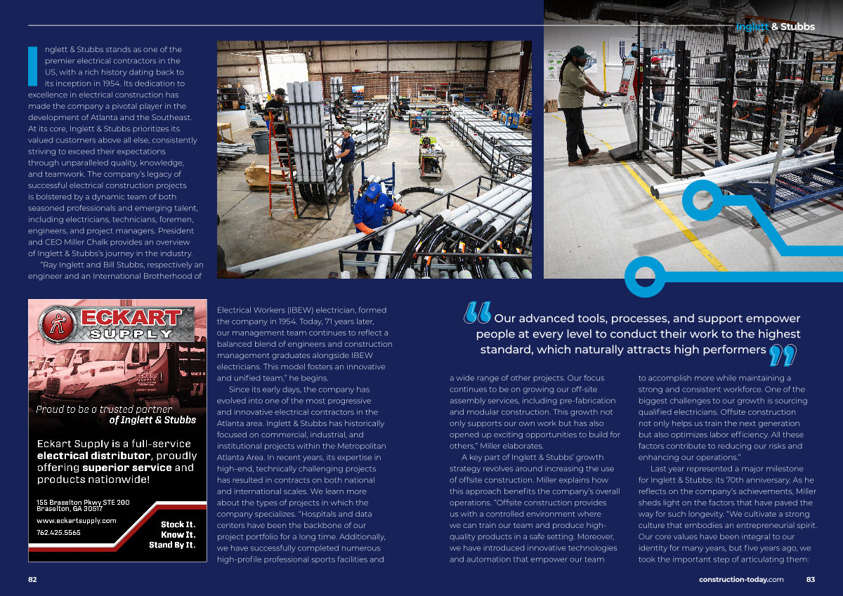 Inglett & Stubbs stands as one of the premier electrical contractors in the US, with a rich history dating back to its inception in 1954. Its dedication to excellence in electrical construction has made the company a pivotal player in the development of Atlanta and the Southeast. At its core, Inglett & Stubbs prioritizes its valued customers above all else, consistently striving to exceed their expectations through unparalleled quality, knowledge, and teamwork. The company’ s legacy of successful electrical construction projects is bolstered by a dynamic team of both seasoned professionals and emerging talent, including electricians, technicians, foremen, engineers, and project managers. President and CEO Miller Chalk provides an overview of Inglett & Stubbs’ s journey in the industry.