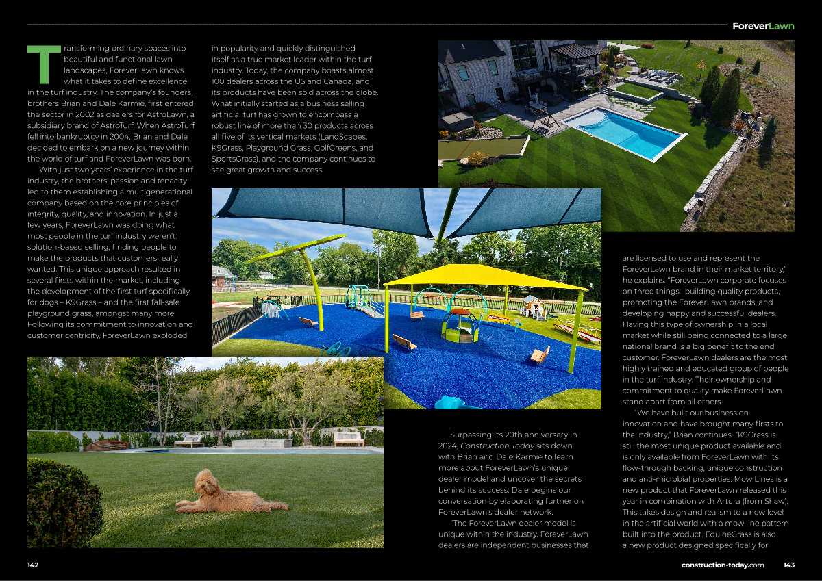 With just two years’ experience in the turf industry, the brothers’ passion and tenacity led to them establishing a multigenerational company based on the core principles of integrity, quality, and innovation. In just a few years, ForeverLawn was doing what most people in the turf industry weren’ t: solution-based selling, finding people to make the products that customers really wanted. This unique approach resulted in several firsts within the market, including the development of the first turf specifically for dogs – K9Grass – and the first fall-safe playground grass, amongst many more. Following its commitment to innovation and customer centricity, ForeverLawn exploded