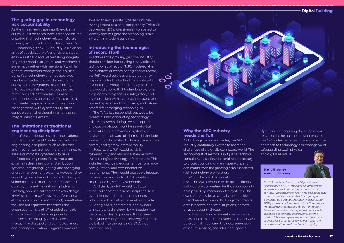 To address this growing gap, the industry should consider introducing a new role: the technologist of record( ToR). Modeled after the architect of record or engineer of record, the ToR would be a designated authority responsible for the technological integrity of a building throughout its lifecycle. This role would ensure that technology systems are properly designed and integrated, and also compliant with cybersecurity standards, resilient against evolving threats, and futureproofed for emerging technologies.
