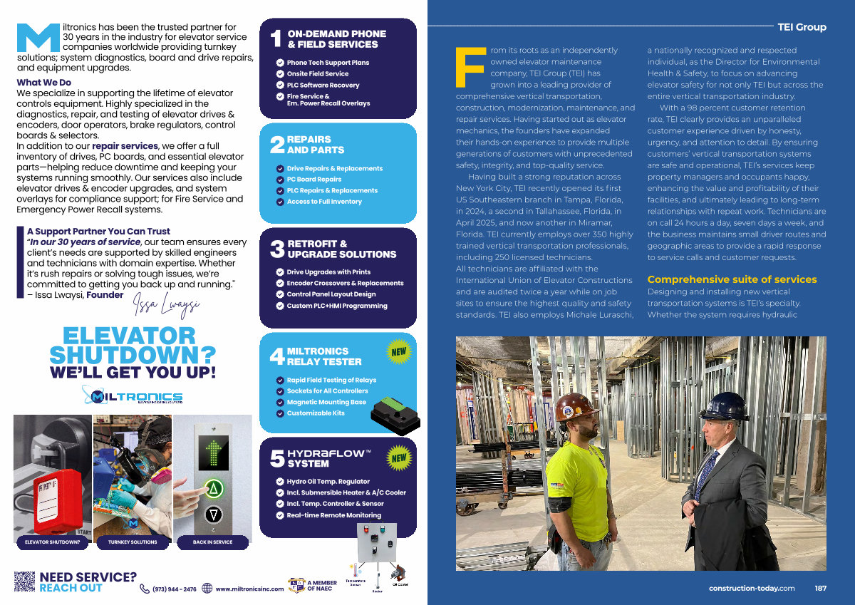 Having built a strong reputation across New York City, TEI recently opened its first US Southeastern branch in Tampa, Florida, in 2024, a second in Tallahassee, Florida, in April 2025, and now another in Miramar, Florida. TEI currently employs over 350 highly trained vertical transportation professionals, including 250 licensed technicians. All technicians are affiliated with the International Union of Elevator Constructions and are audited twice a year while on job sites to ensure the highest quality and safety standards. TEI also employs Michale Luraschi, a nationally recognized and respected individual, as the Director for Environmental Health & Safety, to focus on advancing elevator safety for not only TEI but across the entire vertical transportation industry.