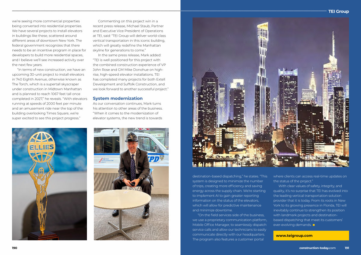 With clear values of safety, integrity, and quality, it’ s no surprise that TEI has evolved into the leading vertical transportation solution provider that it is today. From its roots in New York to its growing presence in Florida, TEI will inevitably continue to strengthen its position with landmark projects and destinationbased dispatching that meet its customers’ ever-evolving demands. ■