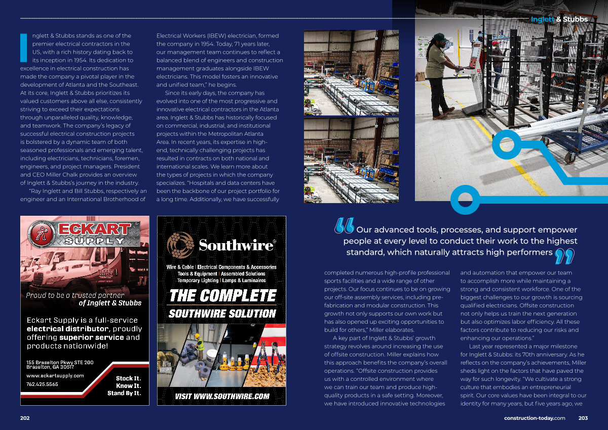 Inglett & Stubbs stands as one of the premier electrical contractors in the US, with a rich history dating back to its inception in 1954. Its dedication to excellence in electrical construction has made the company a pivotal player in the development of Atlanta and the Southeast. At its core, Inglett & Stubbs prioritizes its valued customers above all else, consistently striving to exceed their expectations through unparalleled quality, knowledge, and teamwork. The company’ s legacy of successful electrical construction projects is bolstered by a dynamic team of both seasoned professionals and emerging talent, including electricians, technicians, foremen, engineers, and project managers. President and CEO Miller Chalk provides an overview of Inglett & Stubbs’ s journey in the industry.