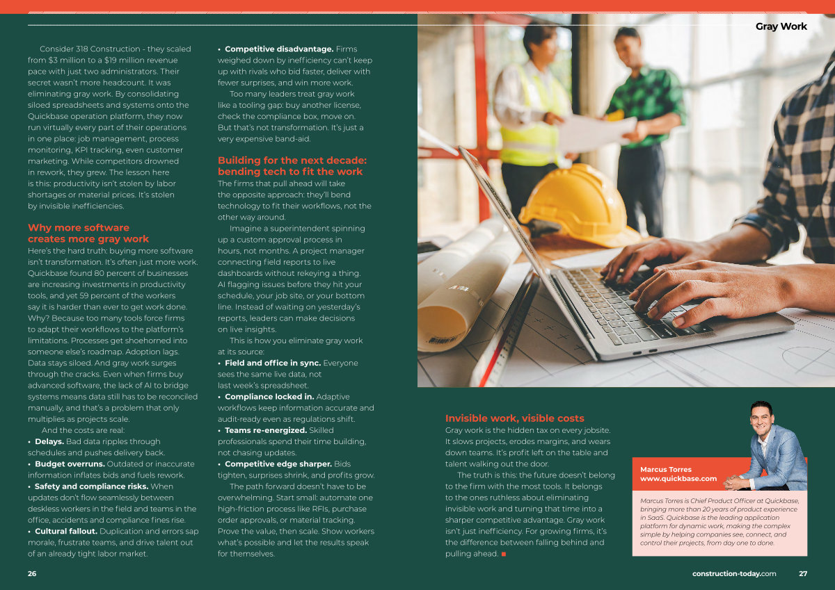 Consider 318 Construction- they scaled from $ 3 million to a $ 19 million revenue pace with just two administrators. Their secret wasn’ t more headcount. It was eliminating gray work. By consolidating siloed spreadsheets and systems onto the Quickbase operation platform, they now run virtually every part of their operations in one place: job management, process monitoring, KPI tracking, even customer marketing. While competitors drowned in rework, they grew. The lesson here is this: productivity isn’ t stolen by labor shortages or material prices. It’ s stolen by invisible inefficiencies.