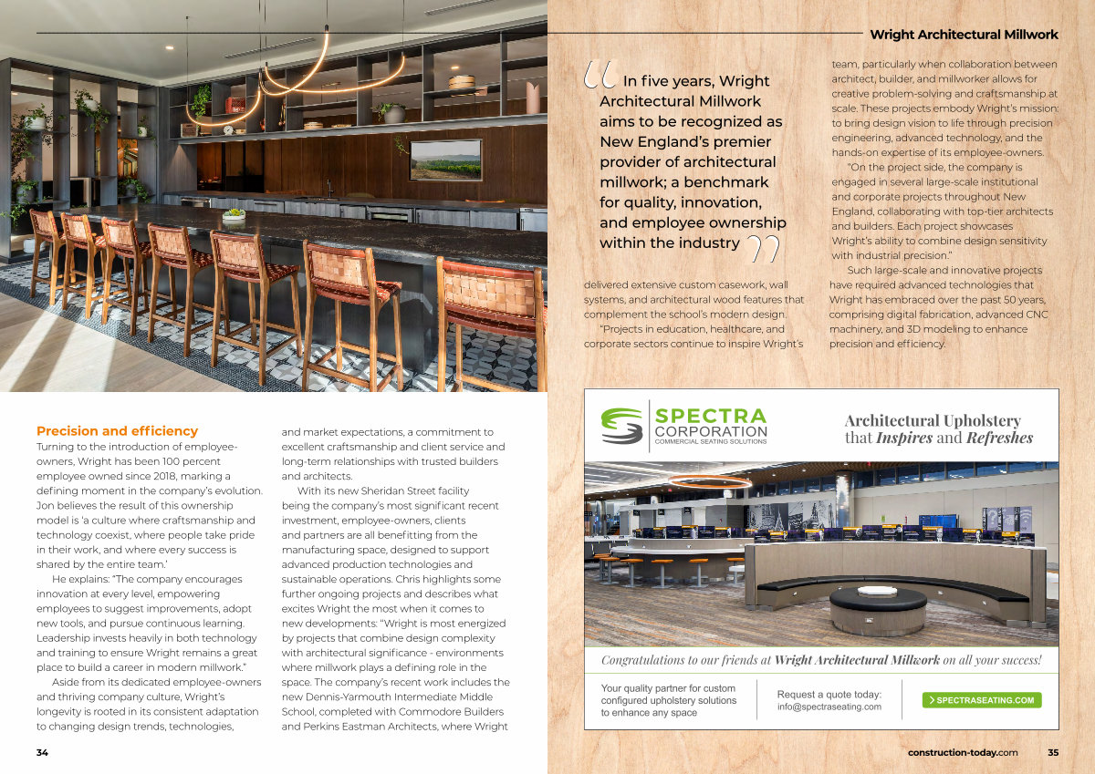 team, particularly when collaboration between architect, builder, and millworker allows for creative problem-solving and craftsmanship at scale. These projects embody Wright’ s mission: to bring design vision to life through precision engineering, advanced technology, and the hands-on expertise of its employee-owners.“ On the project side, the company is engaged in several large-scale institutional and corporate projects throughout New England, collaborating with top-tier architects and builders. Each project showcases Wright’ s ability to combine design sensitivity with industrial precision.”