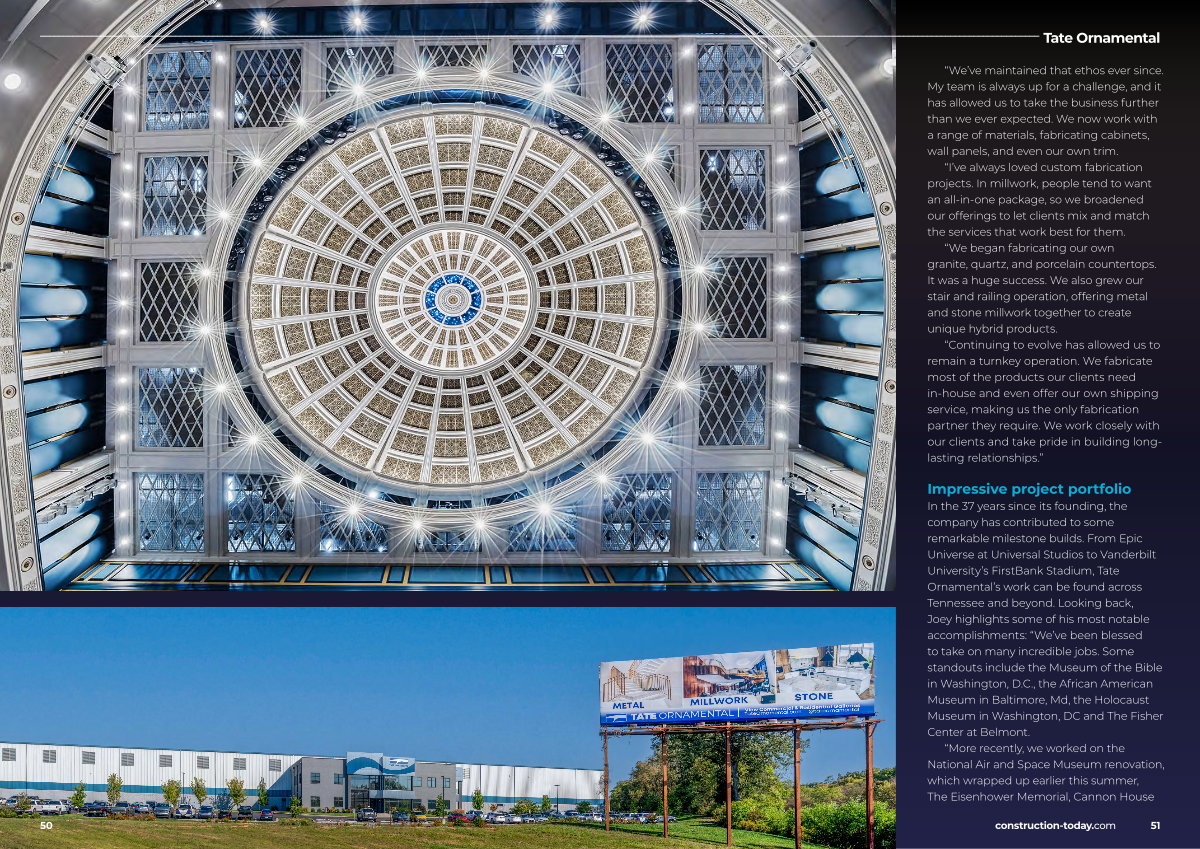 In the 37 years since its founding, the company has contributed to some remarkable milestone builds. From Epic Universe at Universal Studios to Vanderbilt University’ s FirstBank Stadium, Tate Ornamental’ s work can be found across Tennessee and beyond. Looking back, Joey highlights some of his most notable accomplishments:“ We’ ve been blessed to take on many incredible jobs. Some standouts include the Museum of the Bible in Washington, D. C., the African American Museum in Baltimore, Md, the Holocaust Museum in Washington, DC and The Fisher Center at Belmont.
