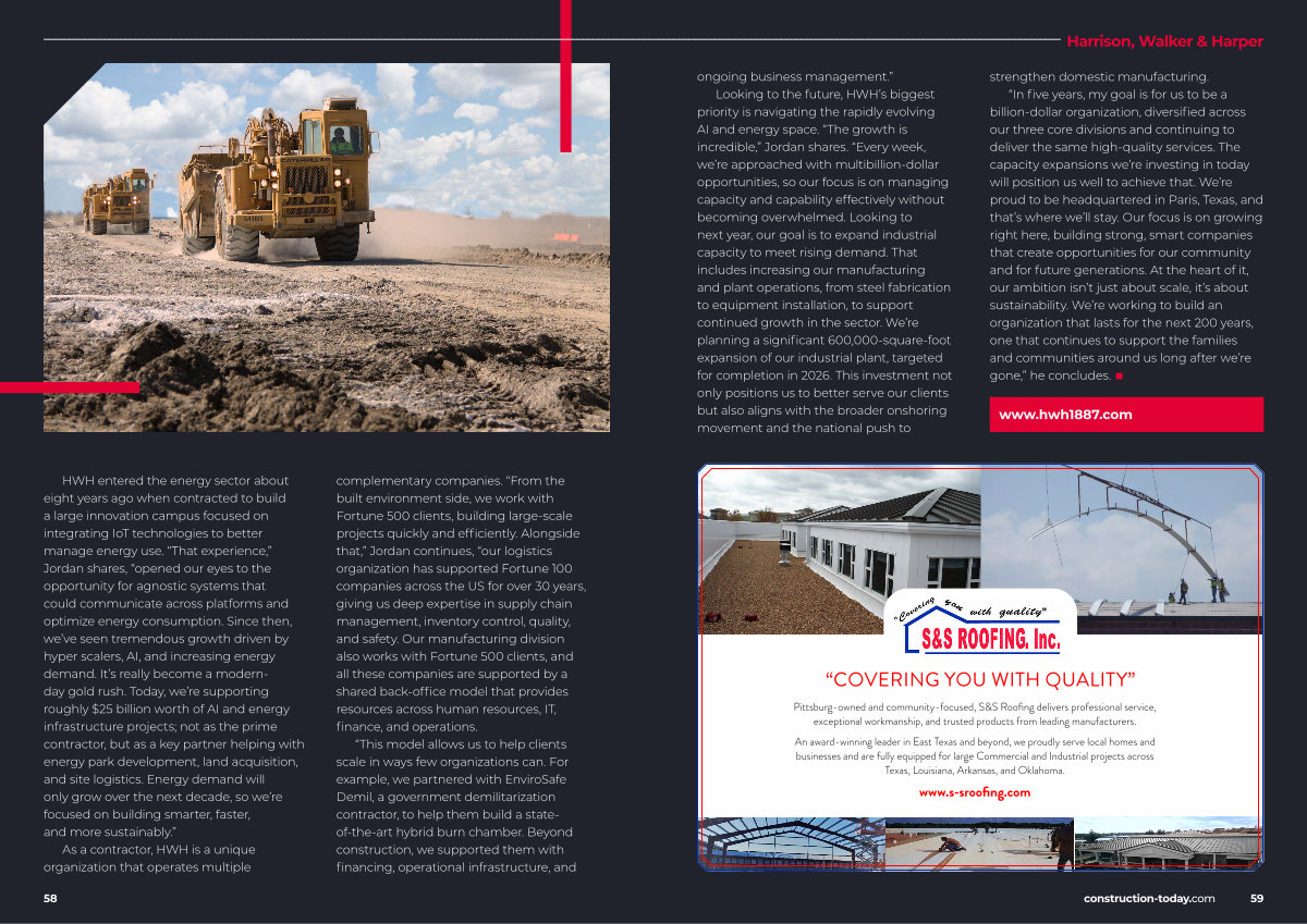 Looking to the future, HWH’ s biggest priority is navigating the rapidly evolving AI and energy space.“ The growth is incredible,” Jordan shares.“ Every week, we’ re approached with multibillion-dollar opportunities, so our focus is on managing capacity and capability effectively without becoming overwhelmed. Looking to next year, our goal is to expand industrial capacity to meet rising demand. That includes increasing our manufacturing and plant operations, from steel fabrication to equipment installation, to support continued growth in the sector. We’ re planning a significant 600,000-square-foot expansion of our industrial plant, targeted for completion in 2026. This investment not only positions us to better serve our clients but also aligns with the broader onshoring movement and the national push to