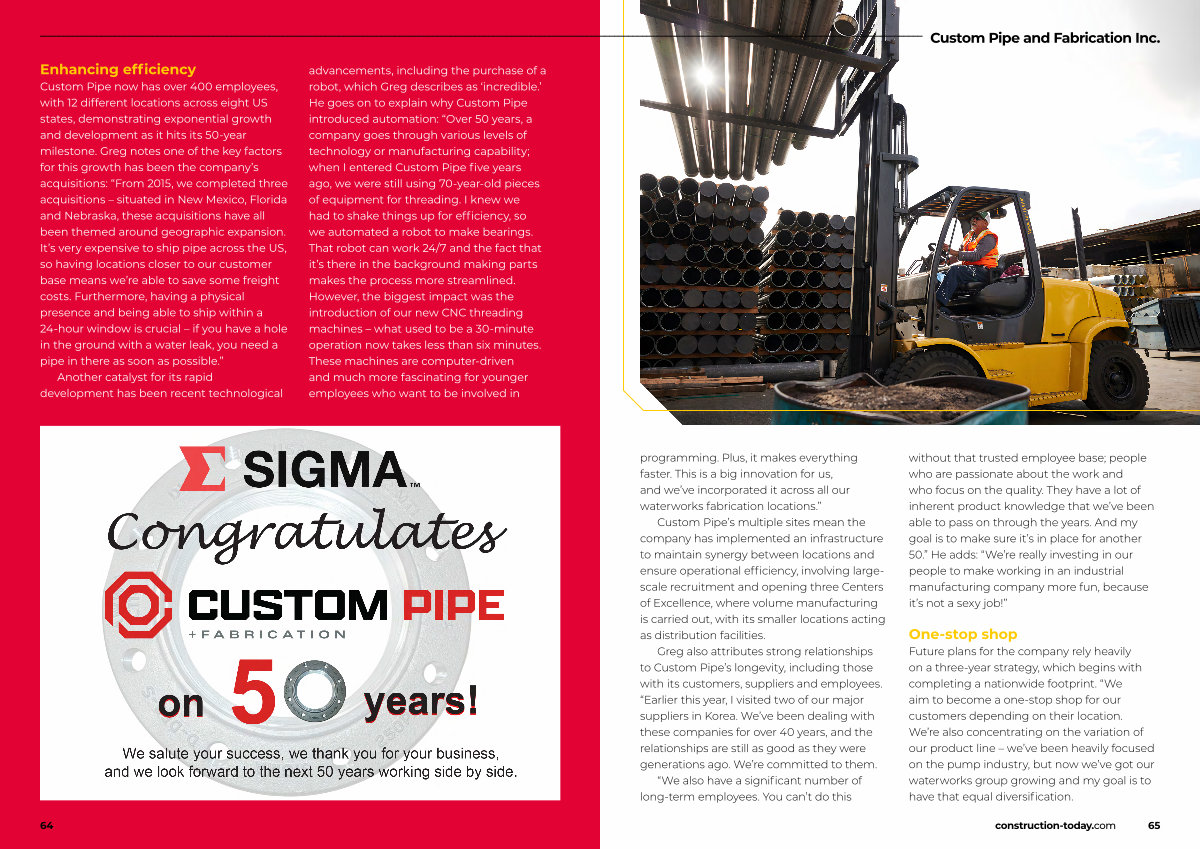 Custom Pipe now has over 400 employees, with 12 different locations across eight US states, demonstrating exponential growth and development as it hits its 50-year milestone. Greg notes one of the key factors for this growth has been the company’ s acquisitions:“ From 2015, we completed three acquisitions – situated in New Mexico, Florida and Nebraska, these acquisitions have all been themed around geographic expansion. It’ s very expensive to ship pipe across the US, so having locations closer to our customer base means we’ re able to save some freight costs. Furthermore, having a physical presence and being able to ship within a 24-hour window is crucial – if you have a hole in the ground with a water leak, you need a pipe in there as soon as possible.” Another catalyst for its rapid development has been recent technological advancements, including the purchase of a robot, which Greg describes as‘ incredible.’ He goes on to explain why Custom Pipe introduced automation:“ Over 50 years, a company goes through various levels of technology or manufacturing capability; when I entered Custom Pipe five years ago, we were still using 70-year-old pieces of equipment for threading. I knew we had to shake things up for efficiency, so we automated a robot to make bearings. That robot can work 24 / 7 and the fact that it’ s there in the background making parts makes the process more streamlined. However, the biggest impact was the introduction of our new CNC threading machines – what used to be a 30-minute operation now takes less than six minutes. These machines are computer-driven and much more fascinating for younger employees who want to be involved in