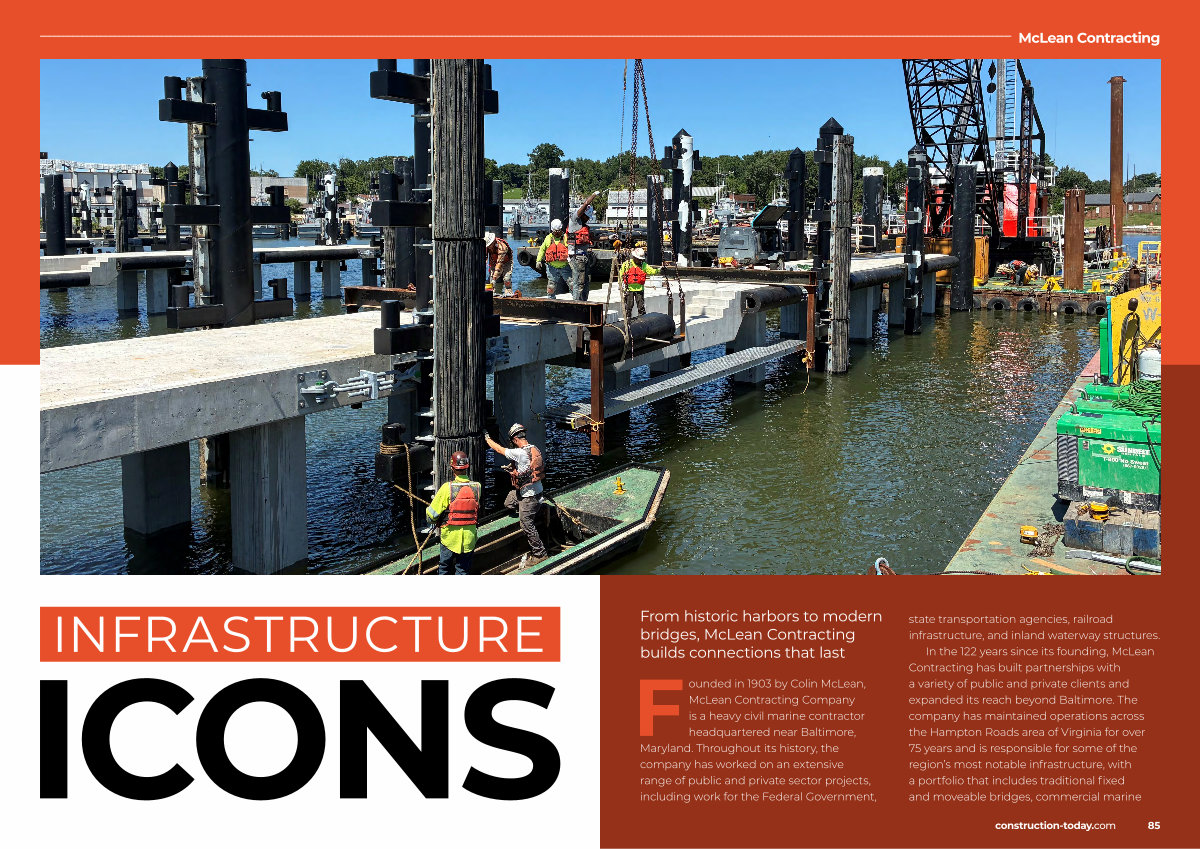 In the 122 years since its founding, McLean Contracting has built partnerships with a variety of public and private clients and expanded its reach beyond Baltimore. The company has maintained operations across the Hampton Roads area of Virginia for over 75 years and is responsible for some of the region’ s most notable infrastructure, with a portfolio that includes traditional fixed and moveable bridges, commercial marine