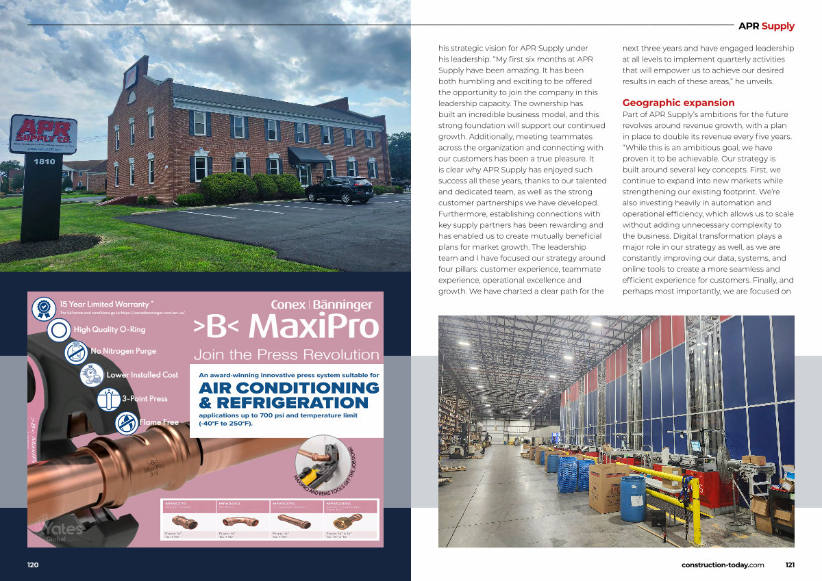 Supply his strategic vision for APR Supply under his leadership.“ My first six months at APR Supply have been amazing. It has been both humbling and exciting to be offered the opportunity to join the company in this leadership capacity. The ownership has built an incredible business model, and this strong foundation will support our continued growth. Additionally, meeting teammates across the organization and connecting with our customers has been a true pleasure. It is clear why APR Supply has enjoyed such success all these years, thanks to our talented and dedicated team, as well as the strong customer partnerships we have developed. Furthermore, establishing connections with key supply partners has been rewarding and has enabled us to create mutually beneficial plans for market growth. The leadership team and I have focused our strategy around four pillars: customer experience, teammate experience, operational excellence and growth. We have charted a clear path for the next three years and have engaged leadership at all levels to implement quarterly activities that will empower us to achieve our desired results in each of these areas,” he unveils.