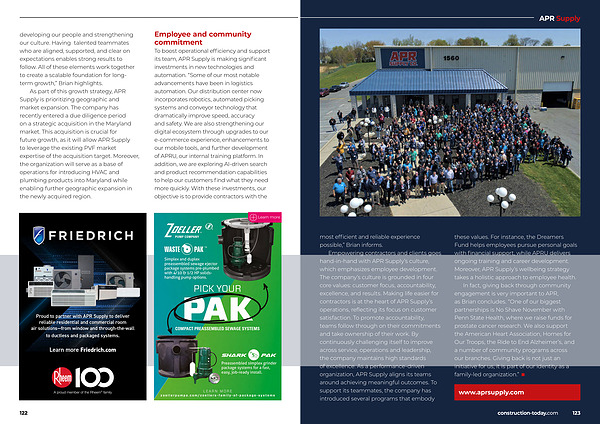 To boost operational efficiency and support its team, APR Supply is making significant investments in new technologies and automation.“ Some of our most notable advancements have been in logistics automation. Our distribution center now incorporates robotics, automated picking systems and conveyor technology that dramatically improve speed, accuracy and safety. We are also strengthening our digital ecosystem through upgrades to our e-commerce experience, enhancements to our mobile tools, and further development of APRU, our internal training platform. In addition, we are exploring AI-driven search and product recommendation capabilities to help our customers find what they need more quickly. With these investments, our objective is to provide contractors with the 122