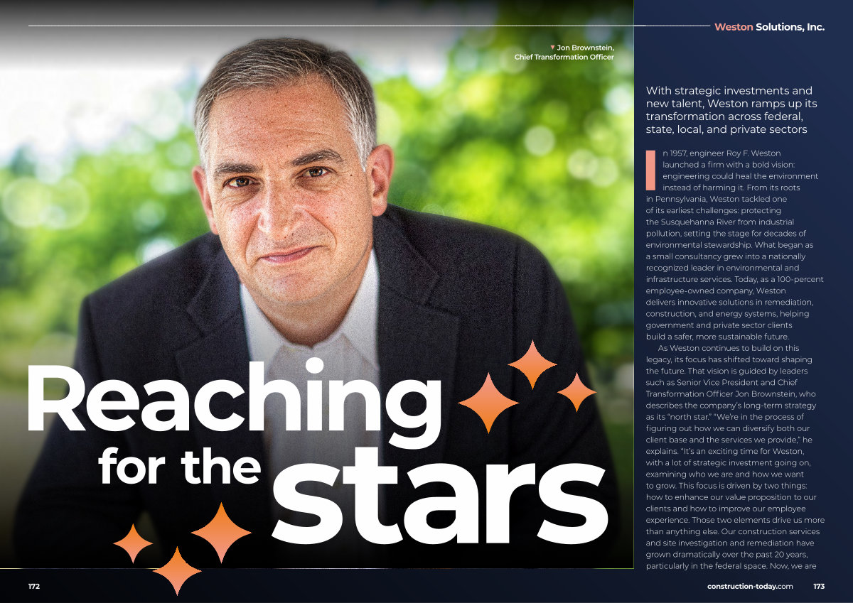 As Weston continues to build on this legacy, its focus has shifted toward shaping the future. That vision is guided by leaders such as Senior Vice President and Chief Transformation Officer Jon Brownstein, who describes the company’ s long-term strategy as its“ north star.”“ We’ re in the process of figuring out how we can diversify both our client base and the services we provide,” he explains.“ It’ s an exciting time for Weston, with a lot of strategic investment going on, examining who we are and how we want to grow. This focus is driven by two things: how to enhance our value proposition to our clients and how to improve our employee experience. Those two elements drive us more than anything else. Our construction services and site investigation and remediation have grown dramatically over the past 20 years, particularly in the federal space. Now, we are