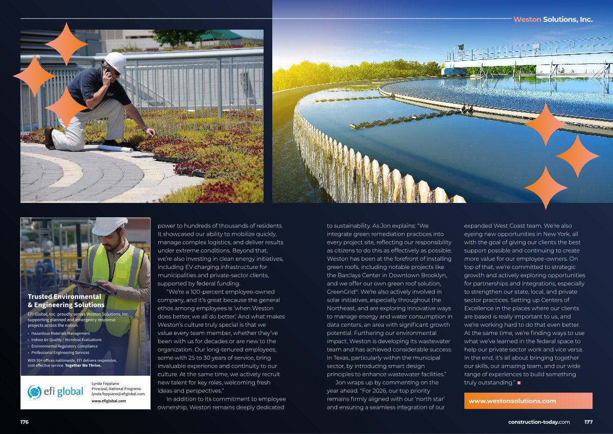 to sustainability. As Jon explains:“ We integrate green remediation practices into every project site, reflecting our responsibility as citizens to do this as effectively as possible. Weston has been at the forefront of installing green roofs, including notable projects like the Barclays Center in Downtown Brooklyn, and we offer our own green roof solution, GreenGrid ®. We’ re also actively involved in solar initiatives, especially throughout the Northeast, and are exploring innovative ways to manage energy and water consumption in data centers, an area with significant growth potential. Furthering our environmental impact, Weston is developing its wastewater team and has achieved considerable success in Texas, particularly within the municipal sector, by introducing smart design principles to enhance wastewater facilities.”