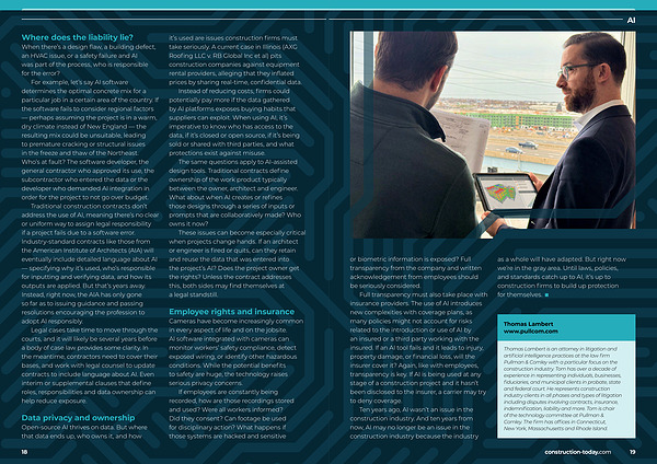 Traditional construction contracts don’ t address the use of AI, meaning there’ s no clear or uniform way to assign legal responsibility if a project fails due to a software error. Industry-standard contracts like those from the American Institute of Architects( AIA) will eventually include detailed language about AI— specifying why it’ s used, who’ s responsible for inputting and verifying data, and how its outputs are applied. But that’ s years away. Instead, right now, the AIA has only gone so far as to issuing guidance and passing resolutions encouraging the profession to adopt AI responsibly.