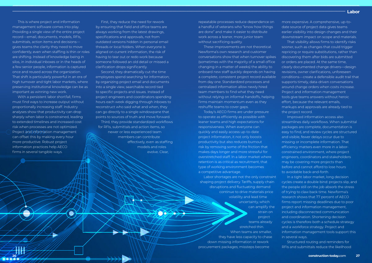 With a persistent labor shortfall, firms must find ways to increase output without proportionally increasing staff. Industry analyses show that productivity can drop sharply when labor is constrained, leading to extended timelines and increased cost risk when processes are not optimized. Project and information management can offset this by making every hour more productive. Robust project information practices help AECO firms in several tangible ways.