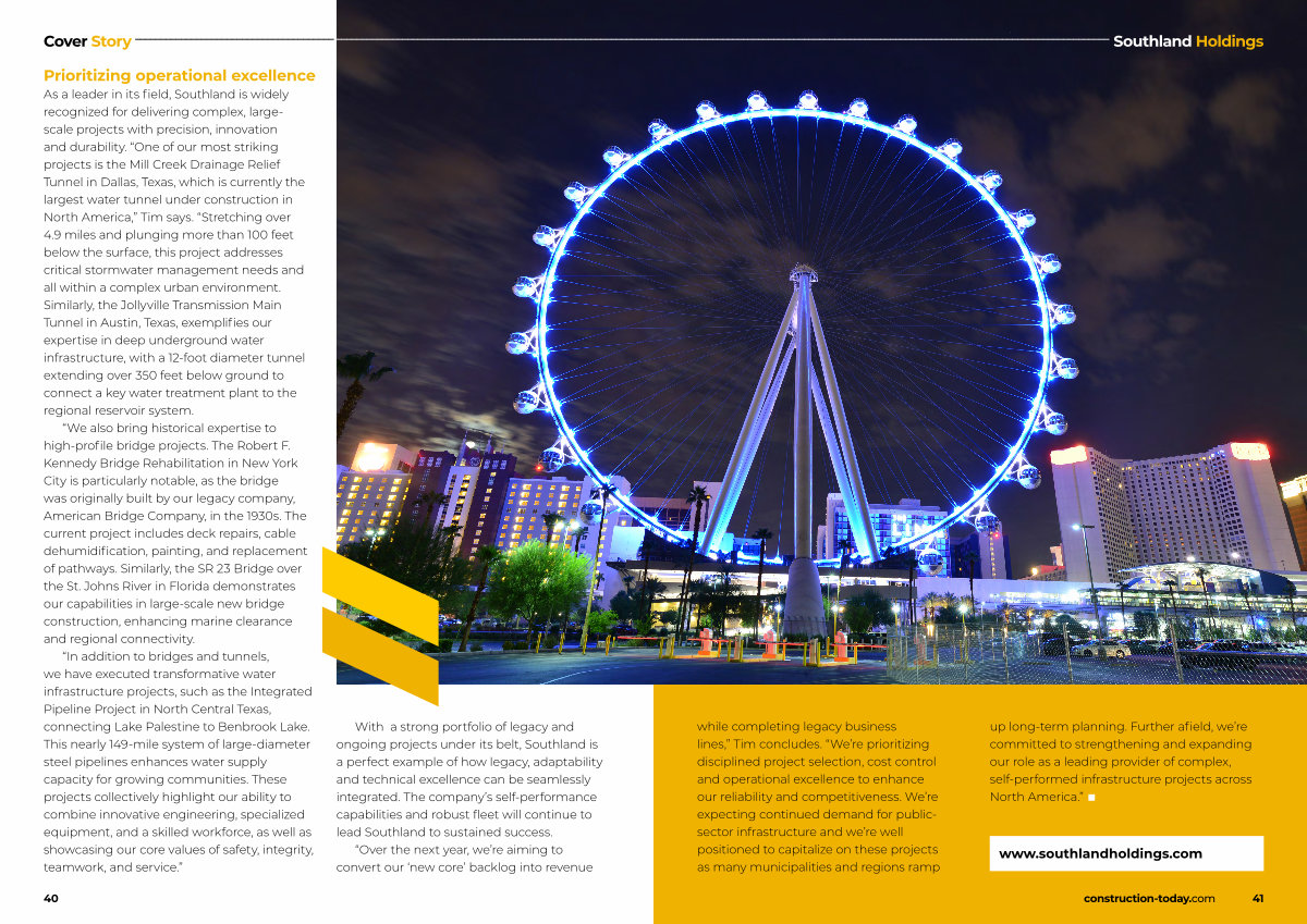 while completing legacy business lines,” Tim concludes.“ We’ re prioritizing disciplined project selection, cost control and operational excellence to enhance our reliability and competitiveness. We’ re expecting continued demand for publicsector infrastructure and we’ re well positioned to capitalize on these projects as many municipalities and regions ramp up long-term planning. Further afield, we’ re committed to strengthening and expanding our role as a leading provider of complex, self-performed infrastructure projects across North America.” ■