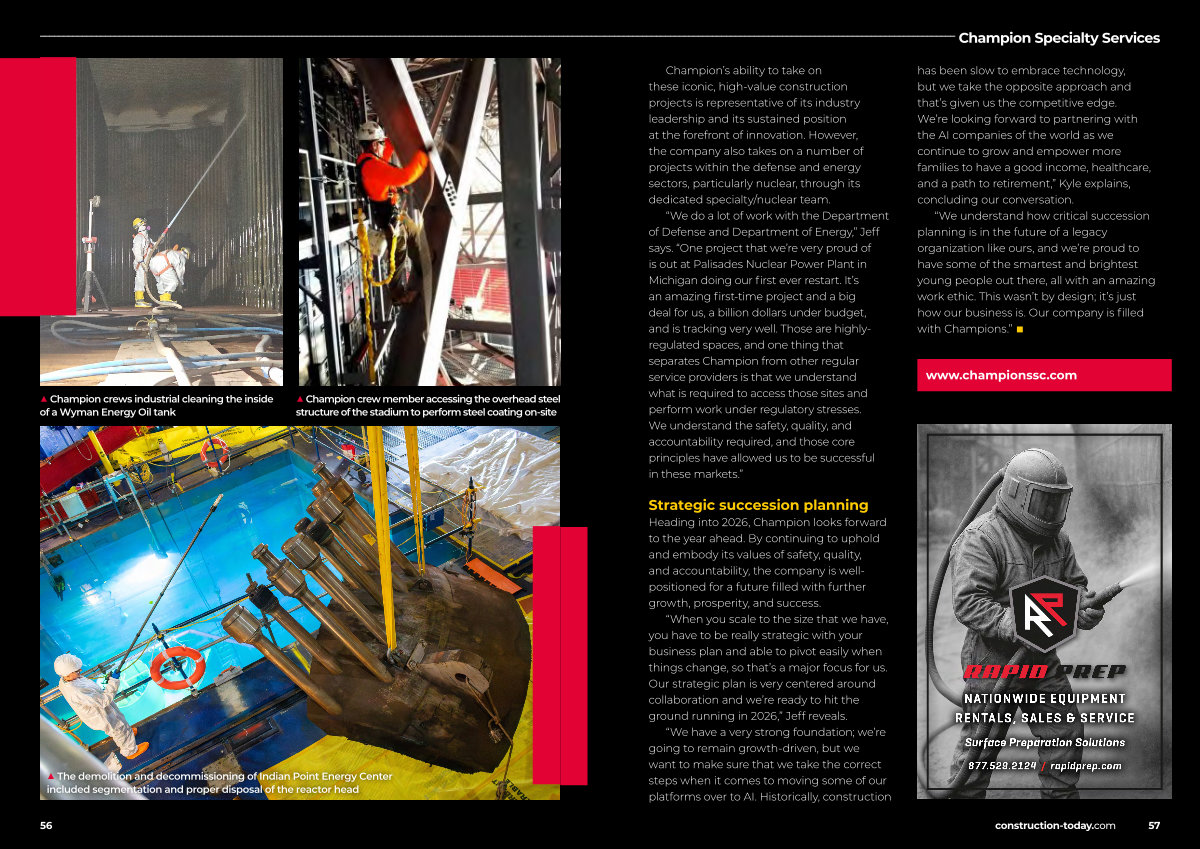 ▲ Champion crew member accessing the overhead steel structure of the stadium to perform steel coating on-site