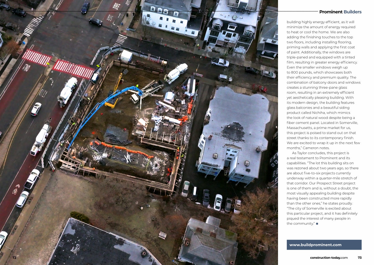 As Taylor concludes, this project is a real testament to Prominent and its capabilities.“ The lot this building sits on was rezoned about two years ago, so there are about five-to-six projects currently underway within a quarter-mile stretch of that corridor. Our Prospect Street project is one of them and is, without a doubt, the most visually appealing building despite having been constructed more rapidly than the other ones,” he states proudly.“ The city of Somerville is excited about this particular project, and it has definitely piqued the interest of many people in the community.” ■