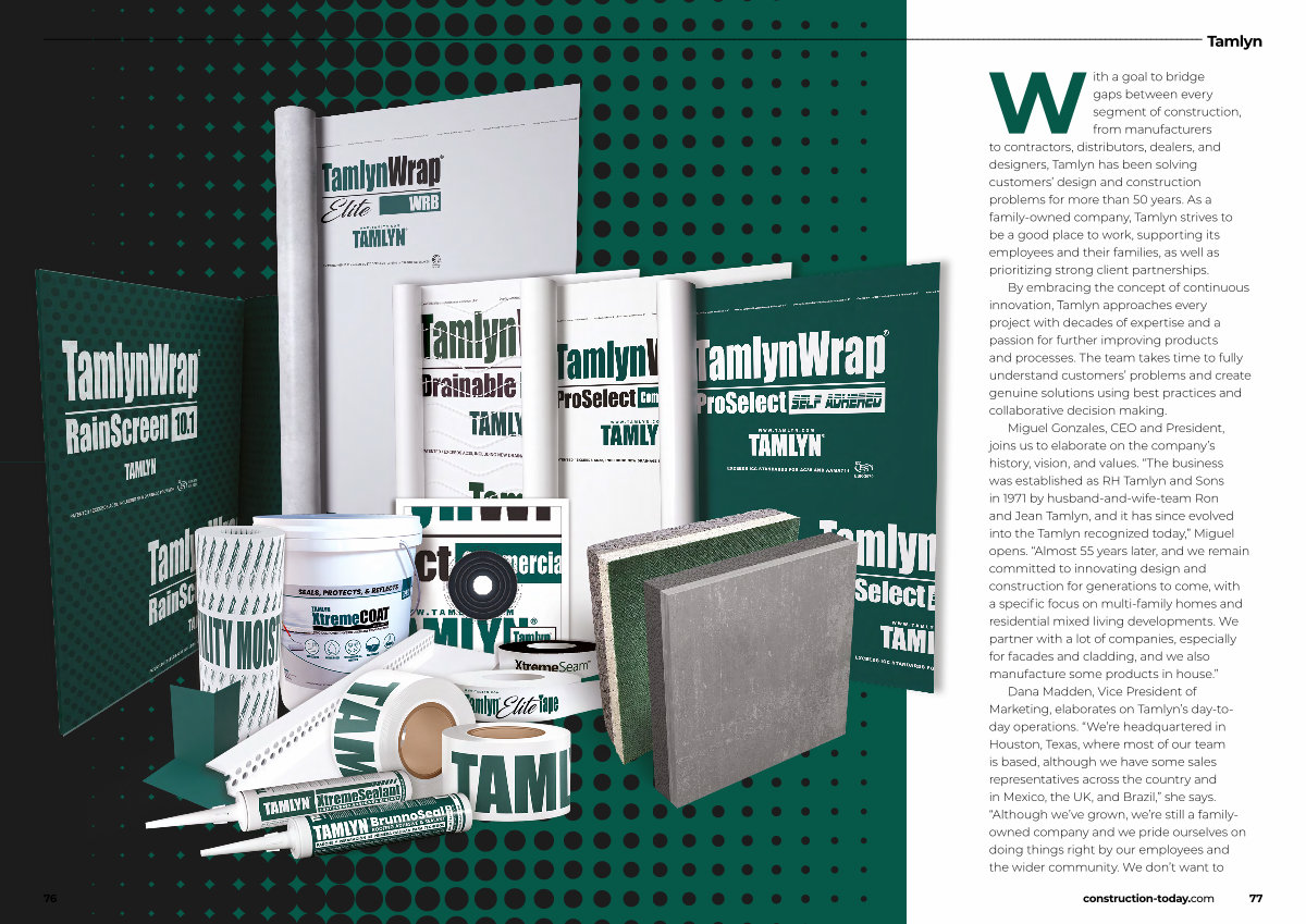 With a goal to bridge gaps between every segment of construction, from manufacturers to contractors, distributors, dealers, and designers, Tamlyn has been solving customers’ design and construction problems for more than 50 years. As a family-owned company, Tamlyn strives to be a good place to work, supporting its employees and their families, as well as prioritizing strong client partnerships.