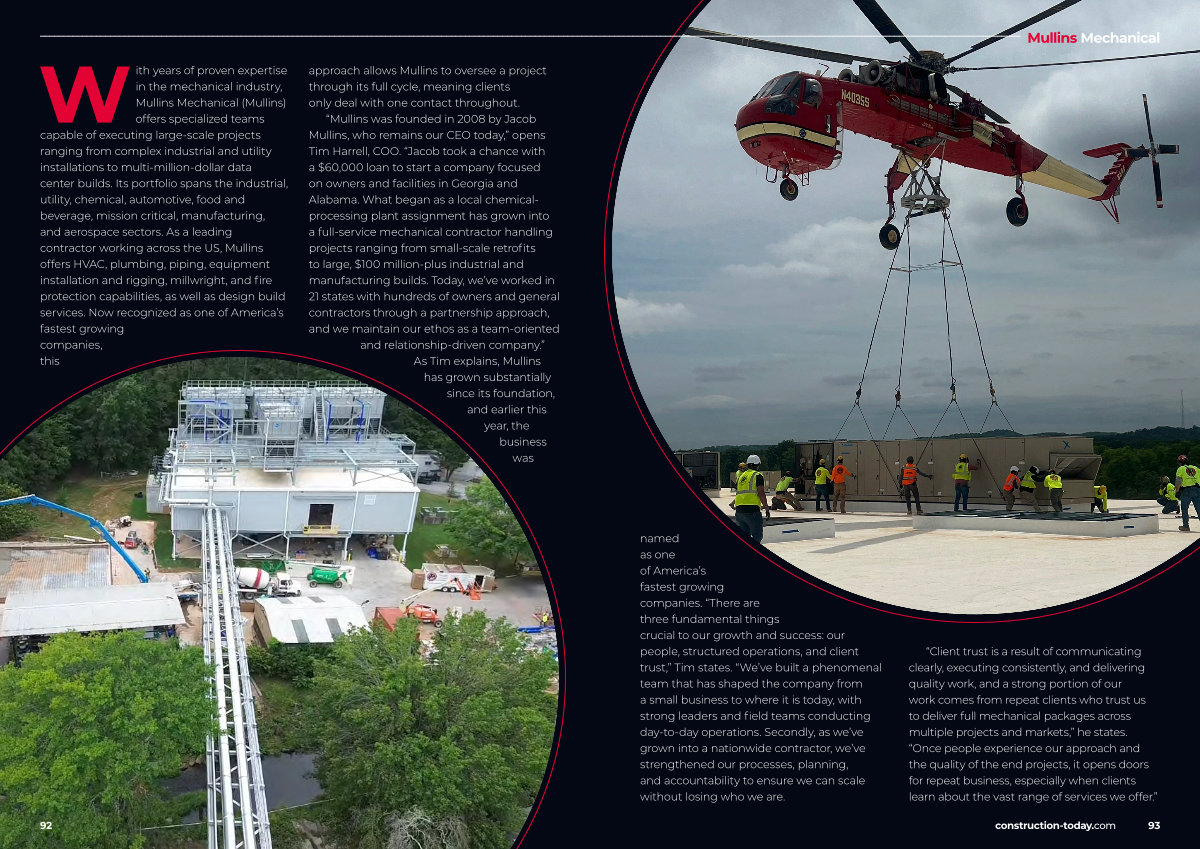 “ Mullins was founded in 2008 by Jacob Mullins, who remains our CEO today,” opens Tim Harrell, COO.“ Jacob took a chance with a $ 60,000 loan to start a company focused on owners and facilities in Georgia and Alabama. What began as a local chemicalprocessing plant assignment has grown into a full-service mechanical contractor handling projects ranging from small-scale retrofits to large, $ 100 million-plus industrial and manufacturing builds. Today, we’ ve worked in 21 states with hundreds of owners and general contractors through a partnership approach, and we maintain our ethos as a team-oriented and relationship-driven company.” As Tim explains, Mullins has grown substantially since its foundation, and earlier this year, the business was